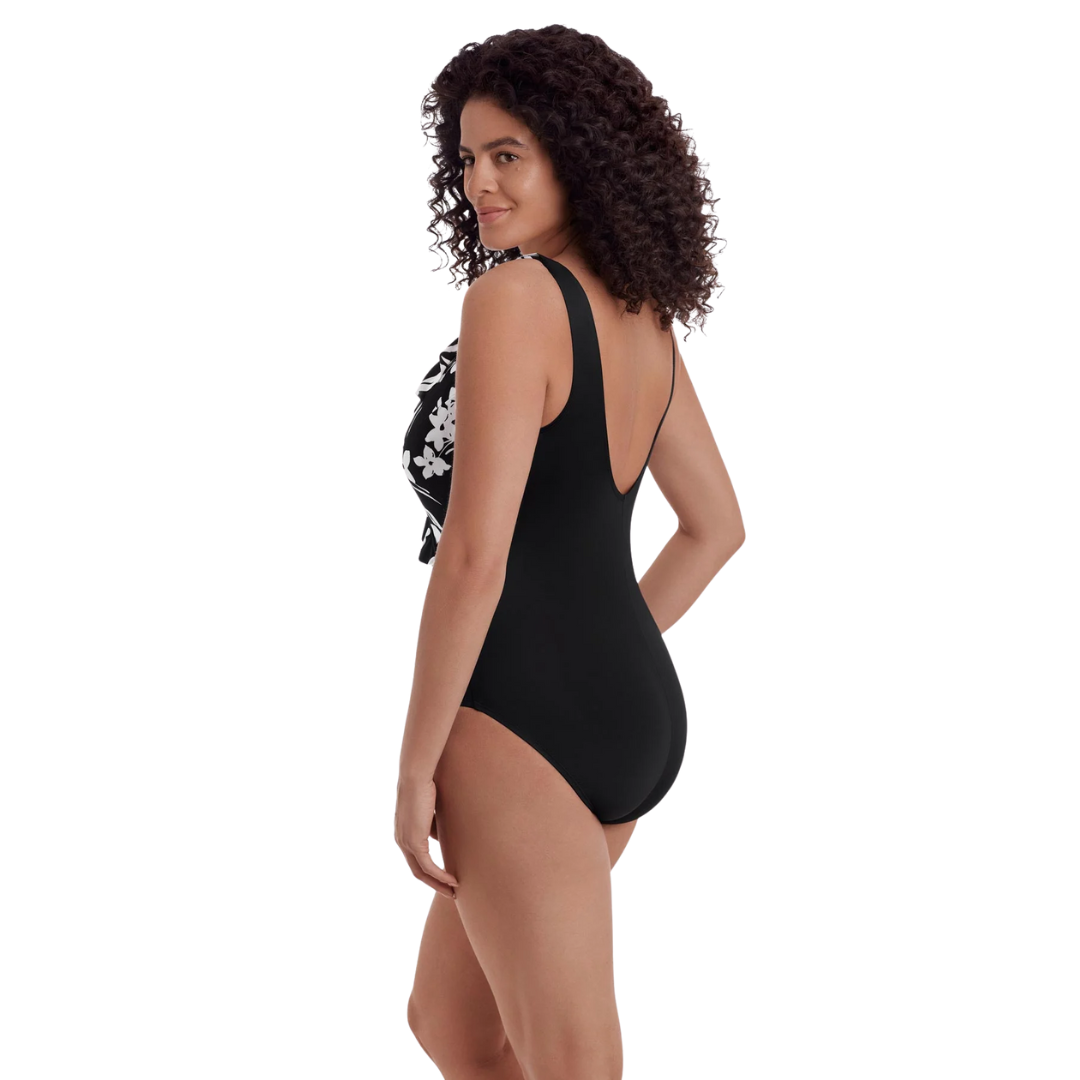 Elegancia y estilo se unen en esta silueta clásica tipo wrap, con un suave volante frontal ajustable que realza las curvas y aporta un movimiento fluido y femenino.